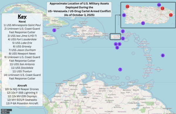 截至10月3日美军在委内瑞拉以北海面上的大致部署,方框中为美国领土波多黎各岛