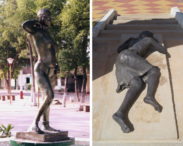 舒丽雅(左)和薄蕾拉(右)都在今天的委内瑞拉有雕像。不过一个是背着毒箭袋、拿着弓挺然屹立的,另一个是趴伏在殖民者丈夫奥赫达坟上的(传说中她殉情而死的场景)。