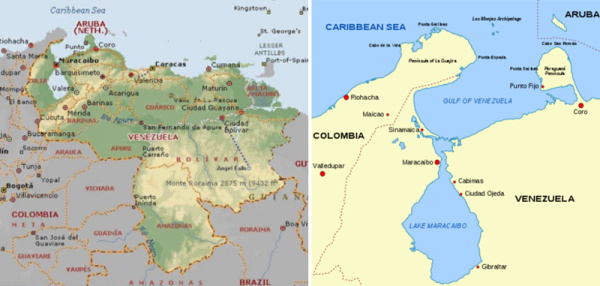 委内瑞拉版图,注意其左上角泪滴状的大湖(右下)、近于长方形的喇叭口海湾(右上)