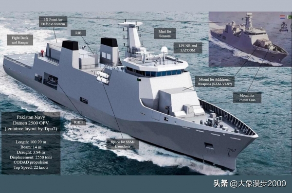 巴基斯坦海军曾从荷兰采购了两艘OPV 2400型巡逻舰,F271雅穆克(2020服役)和F272塔布克(2021服役)。巴基斯坦称为:雅穆克级Batch-I巡逻舰,舰长91.3米,宽14.4米,吃水4米,满载排水量2400吨。采用4台柴油机联合动力,航速22节,续航6000海里/12节。交付时没有武器系统及主要电子设备,但有4门高压水炮。服役后安装了SR-64雷达,预留有反舰巡航导弹发射架。安装了30毫米单管自动炮和密集阵近防炮各一座,以及土耳其的电子桅杆和光电等系统。有直升机甲和直升机机库,船尾甲板下有最多5个集装箱化任务模块的空间。