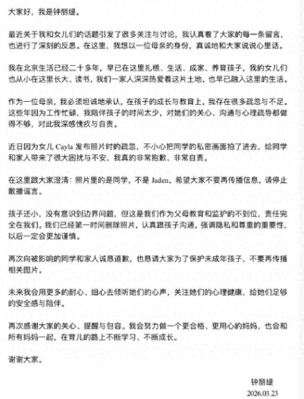 3月23号,钟丽缇终于绷不住,在微博上以妈妈的身份发文道歉,专门回应小女儿考拉的争议,承认自己教育疏忽,还澄清了之前的误会!
