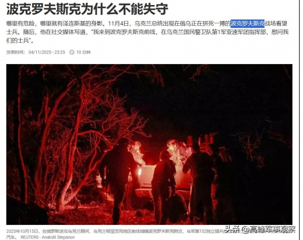11月4日,乌克兰总统泽连斯基现身红军城前线视察督战。把法国媒体感动坏了,法媒满怀钦佩地报道称,哪里有危险,哪里就有泽连斯基的身影!法国媒体称,尽管莫斯科的胜利宣言还为时过早,但乌军也承认在该市陷入困境,俄罗斯前沿部队成功地以小分队形式,突入波克罗夫斯克(红军城),通过渗透破坏行动和定点袭击的战术,试图扰乱红军城内5500名乌克兰防御部队的阵脚。