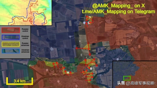 目前,在红军城西北部还有小块市区处于乌军控制下,箭头社等战争媒体标注的俄控区占整个城市面积的85%左右。从地图上看,防御红军城的第155旅残部,已被压缩到季米特洛夫南部,与第79旅残部汇合在一起。但是他们无法向西突破俄军包围转移到红军城西部的赫里希涅地区。原因有二,一是撤退的申请得不到批准,二是罗金西克南部得起1000米缺口完全处于俄军炮火笼罩下,成为乌军不可逾越的瓶颈。