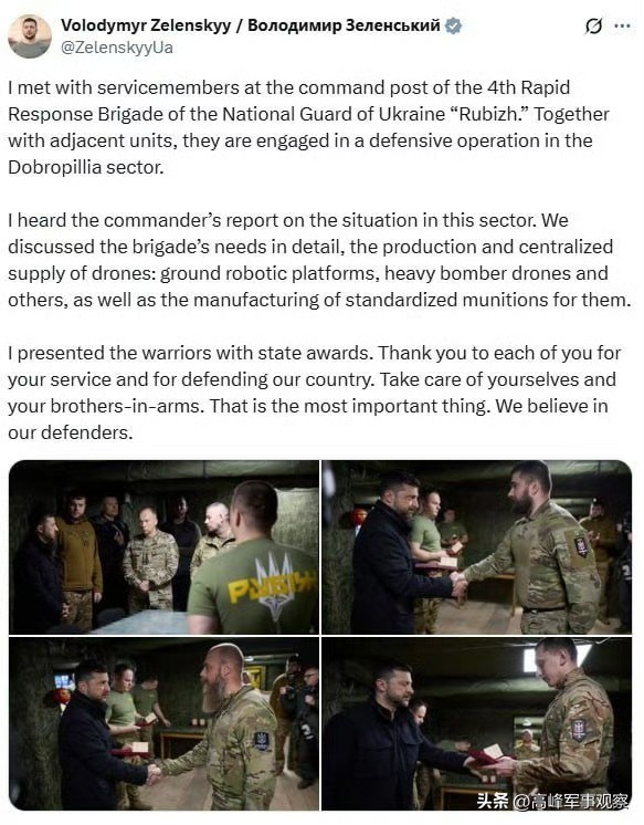 除了第一亚速军之外,泽连斯基还视察了第4"鲁比日"作战旅的指挥所,以及红军村方向的乌军第25"西切斯拉夫"独立空降旅、乌军第7快速反应军团和乌军第414"马扎尔之鸟"独立无人机旅的指挥所。他还亲自为前线乌军代表人物颁发勋章。但是令人怀疑的是,乌军第25"西切斯拉夫"独立空降旅的防区处于季米特洛夫东南部纵深地带,下现在可以说是一块"死地"。泽连斯基和西尔斯基是如何到达那里的?