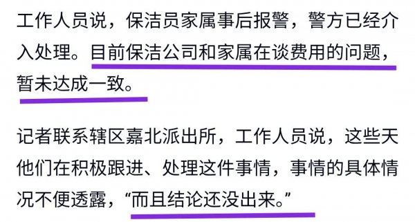 同时表示保洁公司和家属正在商谈费用问题,暂未达成一致,警方也表示事情没查清楚,还没有得出结论!