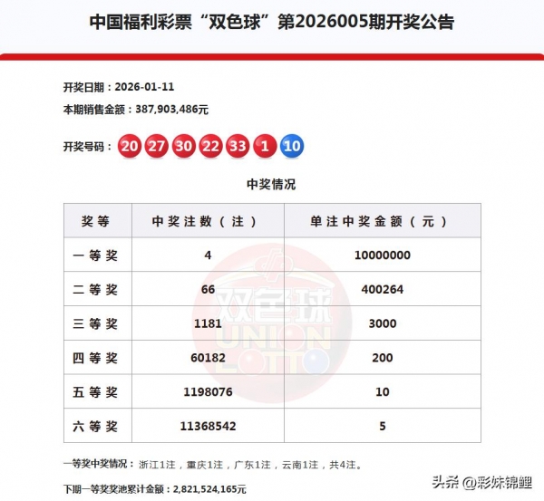 本期开奖日期为2026年1月11日,全国销量3.87亿,筹集公益金 1.30!公益金如春日暖, 爱心汇聚化甘泉。 扶危济困真情在, 善举之光耀世间。