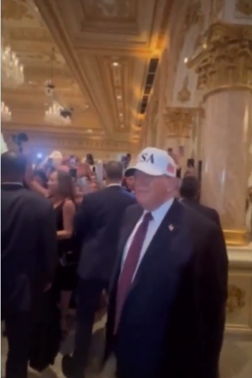 2月27日晚,就在美以联合空袭伊朗前几小时,特朗普还在海湖庄园出席了一场筹款晚宴。现场视频显示,特朗普的装扮和他发表视频讲话时相似,同样带着印有"USA"的帽子。