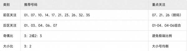 区间分布预测:前区小号区(01-10)关注01、07、10;中号区(11-25)关注14、17、21、23;大号区(26-35)关注26、32、35。奇偶比可关注3:2或2:3,大小比可关注3:2 。