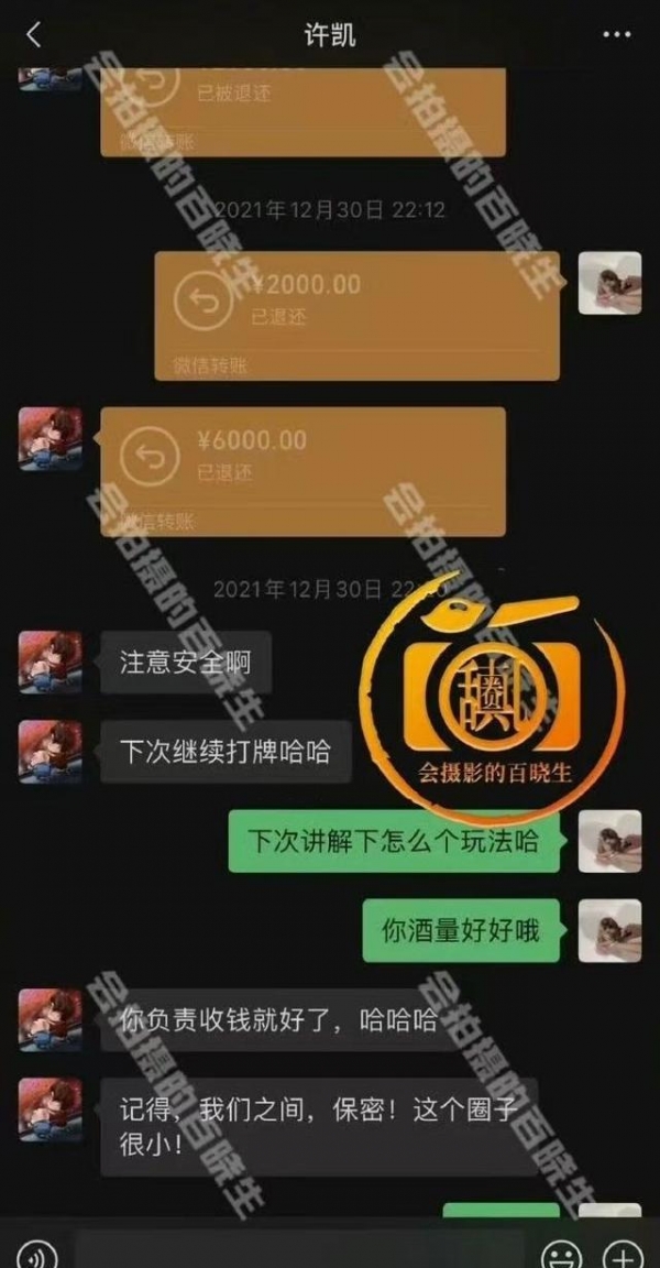 2021年12月30日,《雪鹰领主》杀青夜,许凯在南江壹号招呼剧组同事"小聚",结果牌桌从晚上九点打到凌晨四点,微信转账记录一排8000、12000、5000。