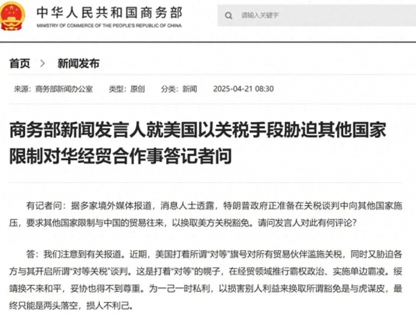 特朗普以关税为要挟,胁迫75国对华"经济断交"。中国商务部一针见血点出"绥靖换不来和平",警告对为虎作伥者决不轻饶。