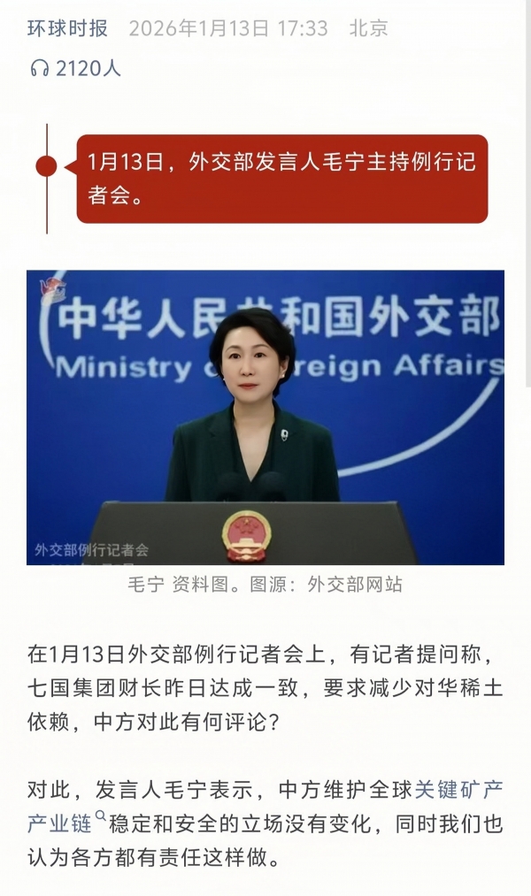 1月13日外交部记者会上,毛宁被问到这事,只回了一句:中方维护全球关键矿产产业链稳定和安全的立场没有变化,各方都有责任这么做。听起来平平淡淡,其实意思很清楚--你们自己行为不端,还想让我松口?没门。