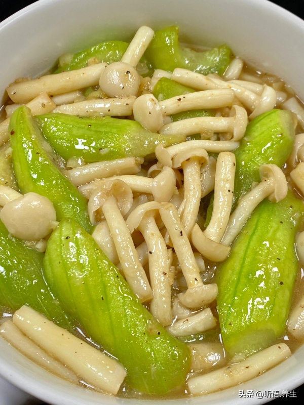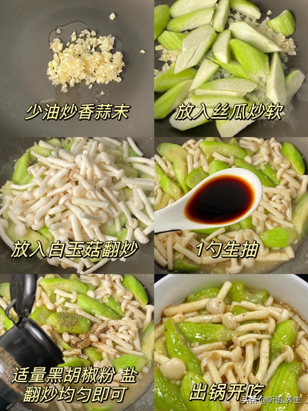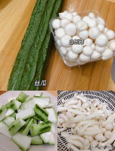 - 小提醒:白玉菇焯水后挤干水分,炒的时候不会出水太多;丝瓜炒时别盖盖,不然容易变黄,影响口感和颜值。