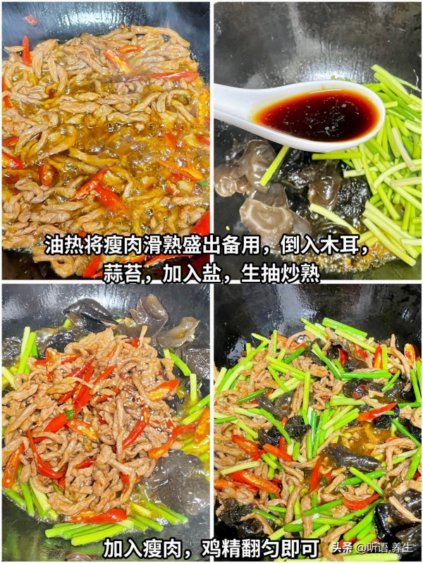 - 小提醒:蒜苔焯水别超过1分钟,不然会软塌;肉丝腌的时候加淀粉,炒出来更嫩,最后翻炒要快,避免蒜苔出水。