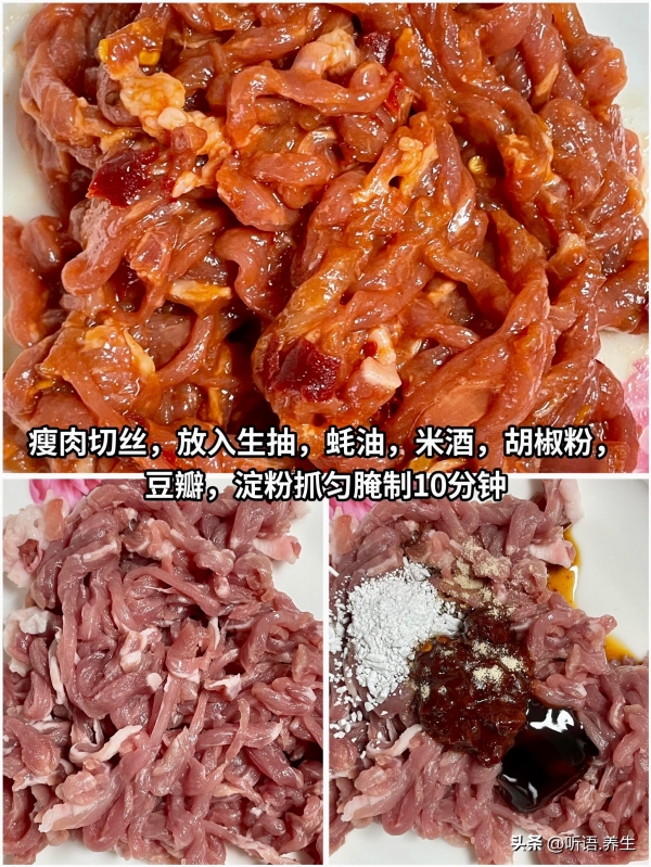 2. 里脊逆着纹理切细丝(逆纹切不柴),加1勺料酒、半勺淀粉、半勺生抽抓匀,腌10分钟锁水;