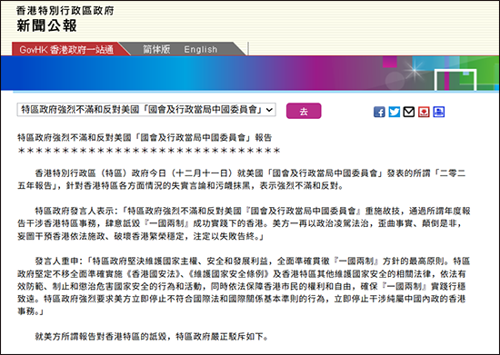 香港特区政府新闻公报网站12月11日消息,香港特别行政区(特区)政府就美国"国会及行政当局中国委员会"发表的所谓"二零二五年报告",针对香港特区各方面情况的失实言论和污蔑抹黑,表示强烈不满和反对。