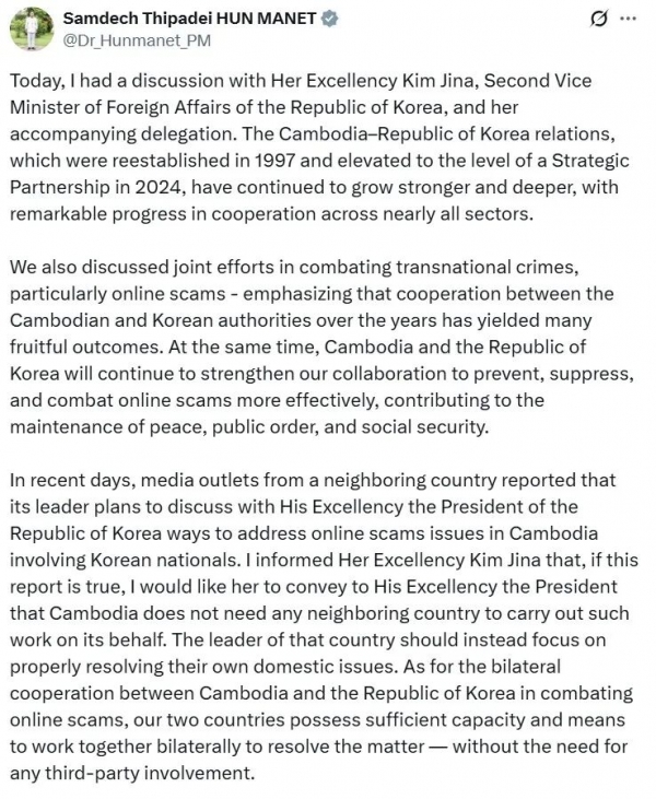 事实上,10月16日,柬埔寨首相洪玛奈在社交平台X发文称,他已与一名韩国官员会面,讨论"打击跨国犯罪,特别是网络诈骗"。他写道:"柬埔寨和韩国将继续加强合作,以更有效地预防、制止和打击网络诈骗。"