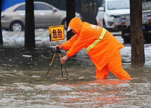 台风影响下出现特大暴雨,工作人员在防止标志牌