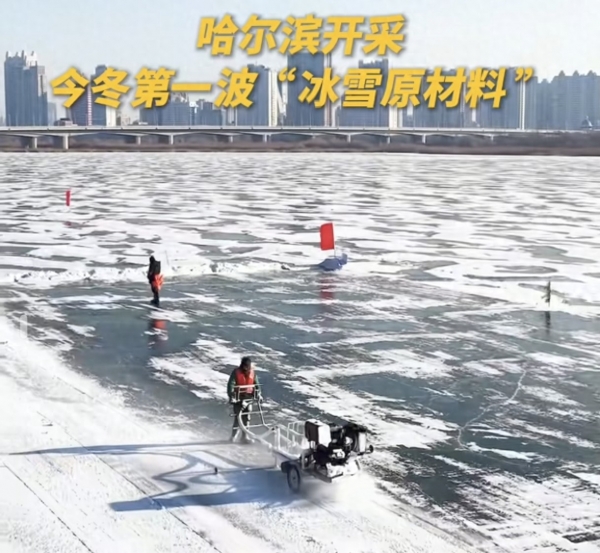 在哈尔滨的结冰湖面上,专业的采冰设备在工人的操作下有序运转。机器轰鸣中,冰层被精准切割,白色的冰屑飞溅,仿佛在为即将到来的冰雪狂欢奏响序曲。