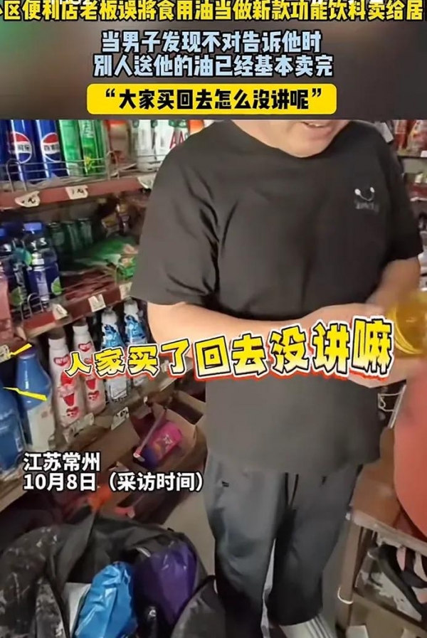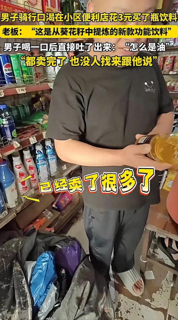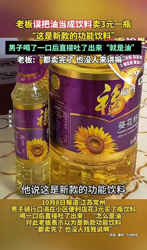 然而,拧开瓶盖喝下一大口后,他立刻感到满口油腻,当场吐了出来。仔细查看瓶身,才发现这竟是一瓶纯正的食用油。男子随即返回便利店与老板对质,老板这才恍然大悟--原来,这批食用油是朋友赠送的礼品,因其包装酷似饮料瓶,被他误当成"新款功能饮料"上架销售。