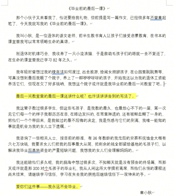 有人给她出了个题,让她写高考作文《毕业前最后一课》。她琢磨了好久,把这些流浪猫狗当成了自己的"学生",写着写着就动了真感情,还在作文里立下遗嘱,说自己走后剩下的钱都要留给这些"毛孩子"。