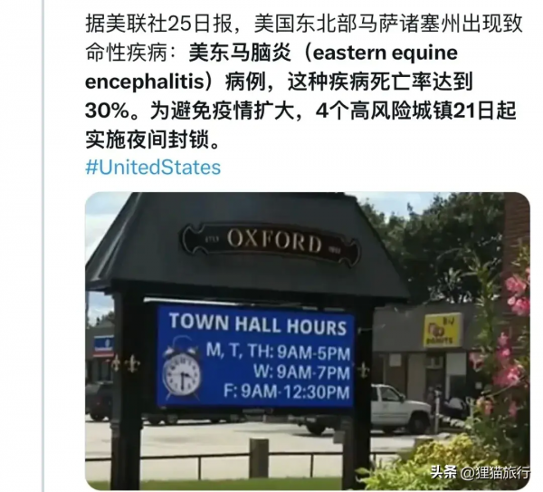 这样一看东部马脑炎还真的挺危险,难怪向来自由惯了,不想被约束的美国人都主动开始封锁4个城镇。这4个城镇包括牛津、道格拉斯、萨顿、韦伯斯特,都在麻省境内,都不是大城市。