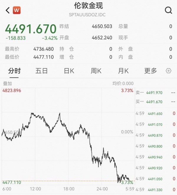 现货黄金价格跌破4500美元,创43年最大单周跌幅。