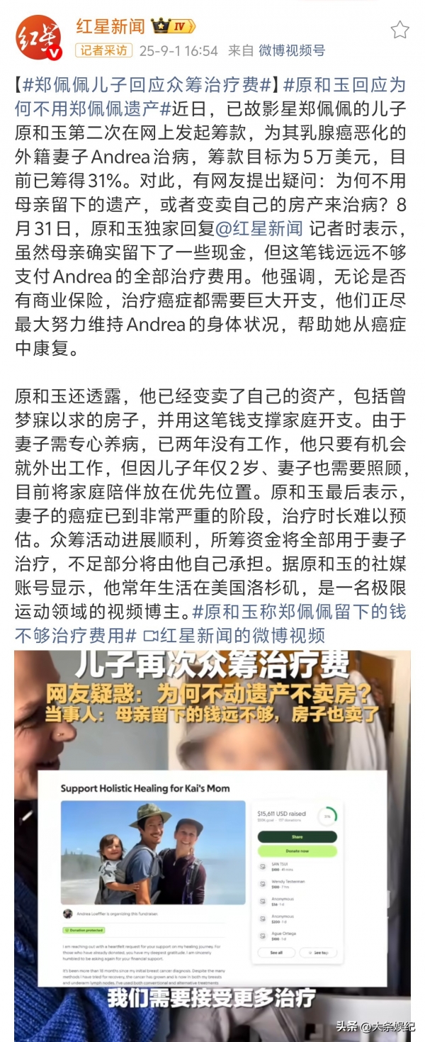 郑佩佩儿子原和玉前段时间在网上为患癌的妻子众筹治疗资金,但是四天过去了才筹集了1万美元。网友疑惑为什么星二代需要网上求助,他回应他们的房子已经变卖,妈妈郑佩佩留下的钱也远远不够。