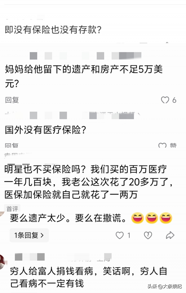 网友依旧认为他在骗钱,毕竟明星和明星的后代终究跟普通人不一样。存款没有,商业保险、医疗保险应该也会有。而且就算再怎么样,郑佩佩留下的遗产不至于5万美元都没有吧。