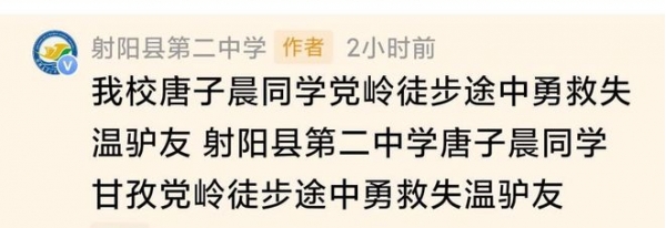 16岁的高一学生是射阳县第二中学的学生,学校官方账号也发布了视频,表扬该同学救助失温年轻女子的事件。