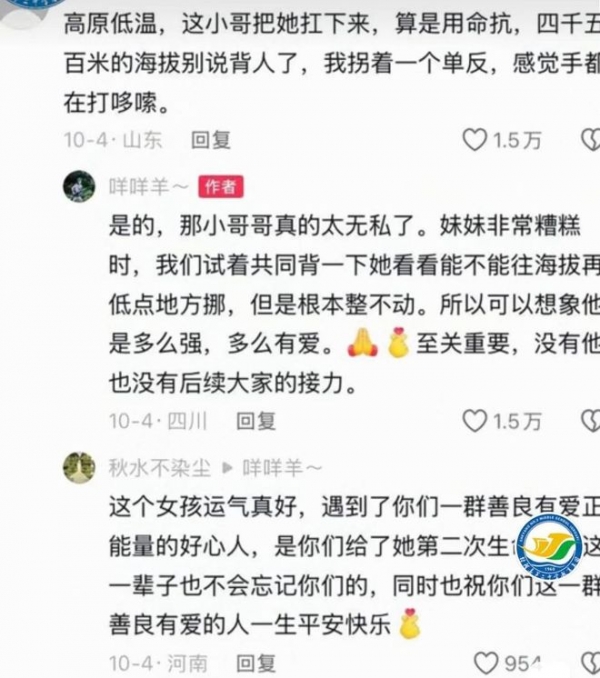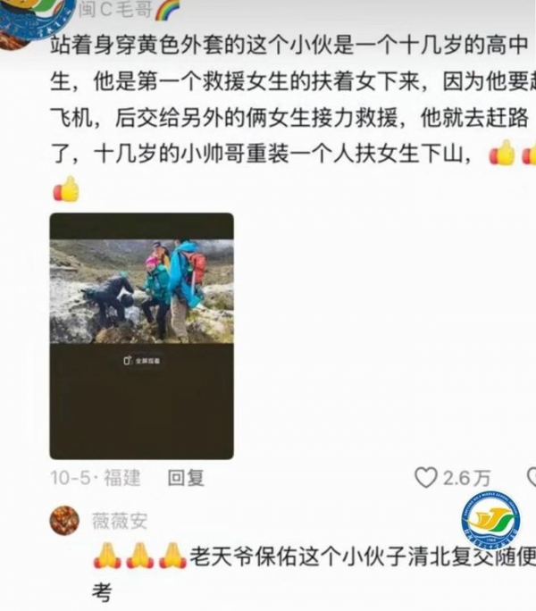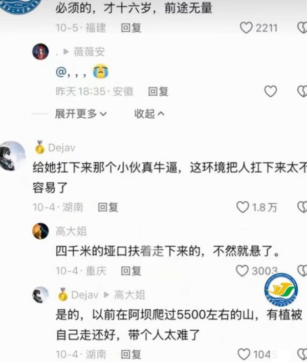 他们当时两男两女一起上山,后来女孩有高反了,刚好遇到了江苏盐城的两位老乡,一个是16岁的高中生,一个是高中生的师傅,他们两个当时一起徒步,对方就把女孩拜托给两位江苏盐城老乡,16岁的高中生然就扶着女孩下山到海拔低一点的位置,途中遇到了上海的两位医生。