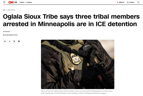 1月8日,Oglala Sioux部落主席表示,他"得知"美国移民和海关执法局在明尼阿波利斯拘留了该部落的三名成员。 图片截自CNN网站