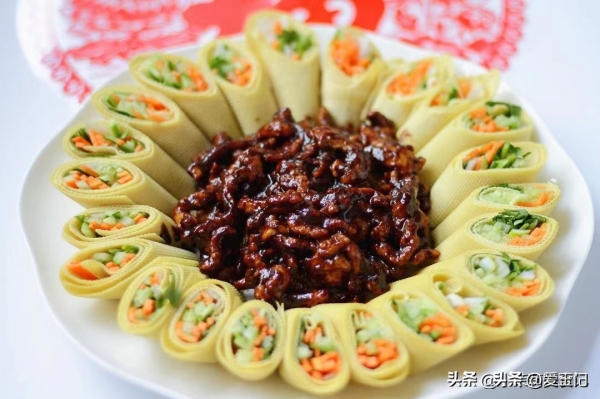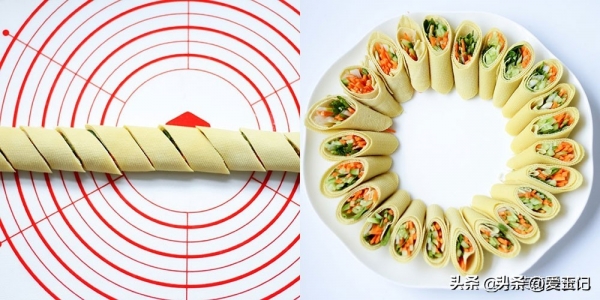 3、来切点蔬菜,胡萝卜,香菜,黄瓜丝,都切得细一些。把千张在案板上铺开,将蔬菜从底部铺一长条形状,用千张将其卷起来,然后斜着下刀去切成均匀的小段,摆在盘中。