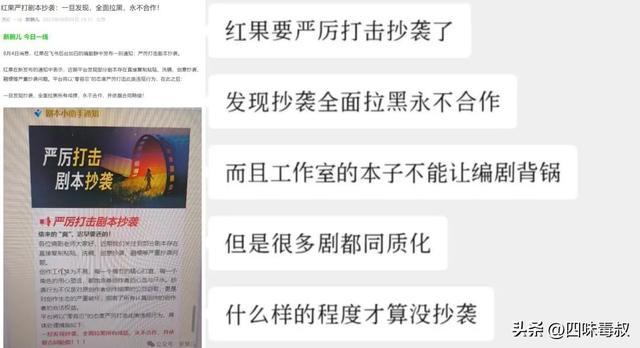 尤其是本周一(8月4日),红果平台在飞书后台加白的编剧群里发布通知,表示将严厉打击剧本抄袭,并说明此后一经发现,将全面拉黑所有成绩,永不合作。