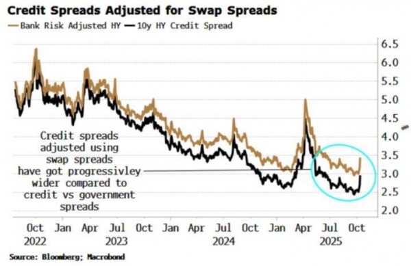 然而,情况正在变化。据报道,随着全球贸易紧张局势再起,以及一家负债百亿美金的公司First Brands宣告破产且据称有超过20亿美元资金"不翼而飞",信贷利差近期重新走阔。