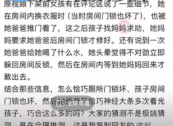 另外,女孩之前还在评论区补充说,自己房间和浴室的门锁之前坏了很久,跟母亲说过之后才修好,还提到曾怀疑父亲给她喝的水有问题,喝了会头晕。