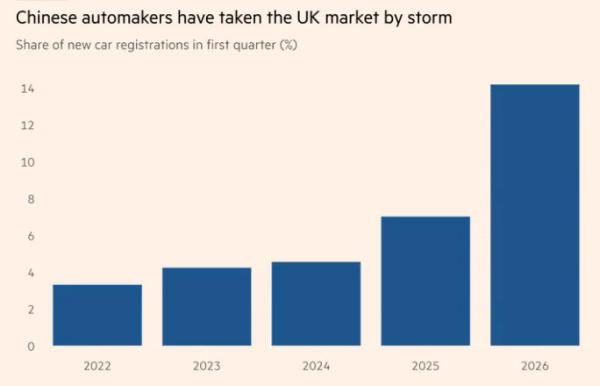 数据显示,中国车企3月在英市场份额翻倍 《金融时报》制图