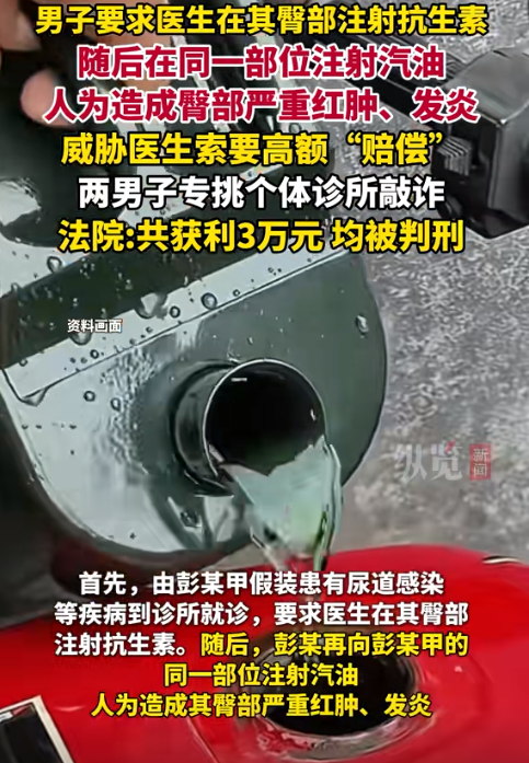 整个过程分工明确:彭某甲装成普通病人,说自己尿道感染或者感冒,要求在屁股上打一针,然后同伙彭某就在旅馆里,对着同一个地方,把汽油打进去,屁股这个位置也选得很刁钻,好操作,平时衣服一遮谁也看不见,他们甚至反复试过剂量,要的就是效果够惨,但又不能真把自己玩死。