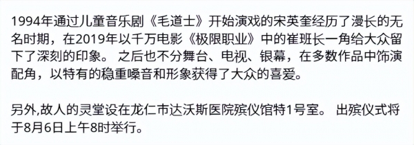 宋英奎的家属已经宣布将在8月6日举行出殡,目前遗体安排在市区某医院的殡仪馆。