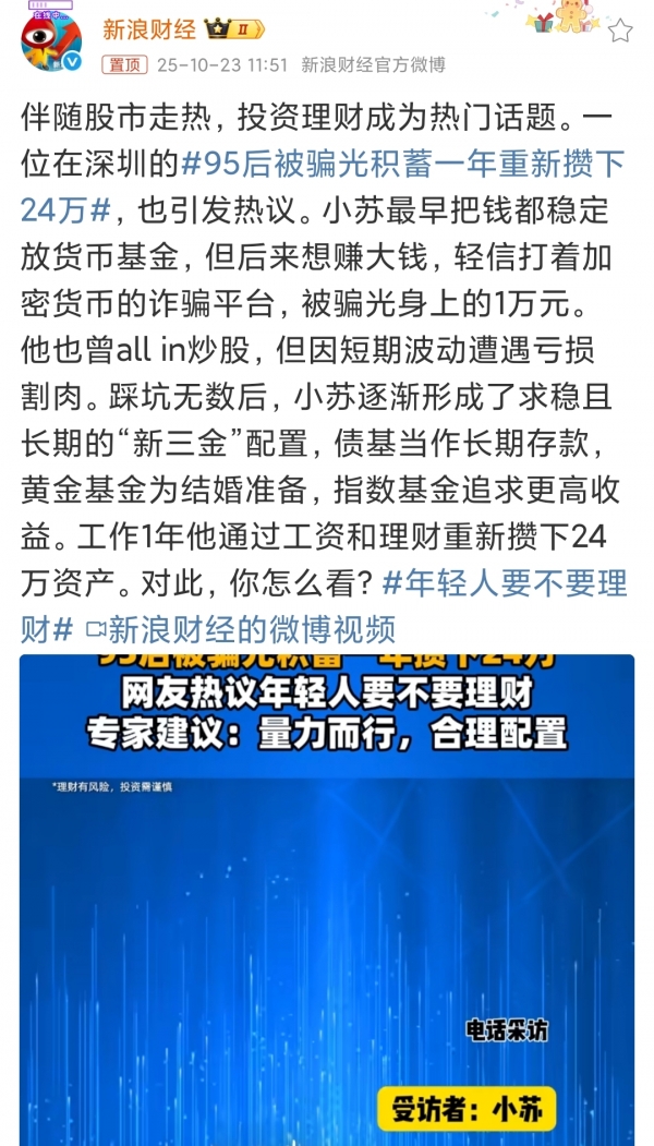 #95后被骗光积蓄一年重新攒下24万# 理财是"大后期"职业,学经验越早越好,前期边存钱边学习,积累了一定知识和资金就可以尝试练手
