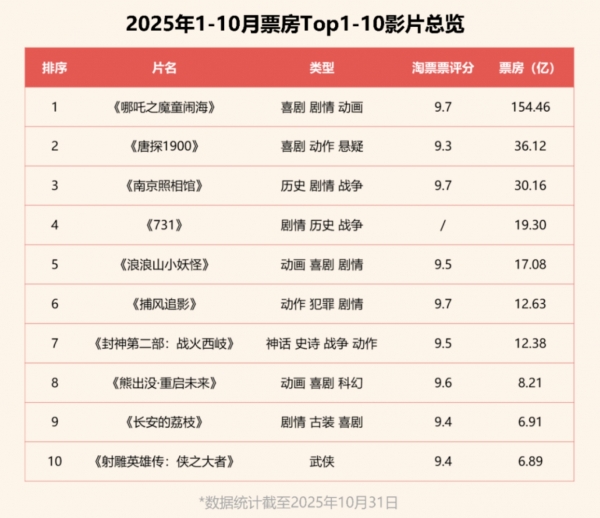 根据灯塔专业版的统计,今年前10个月,《哪吒之魔童闹海》一部电影以 154.46 亿元撑起了将近 1/3 的总票房,远远甩开排名第二的《唐探1900》。票房排名前十的电影中,只有 7 部票房超 10 亿,只有 3 部票房超 20 亿。倘若没有《哪吒》,今年的院线电影市场简直不堪想象。