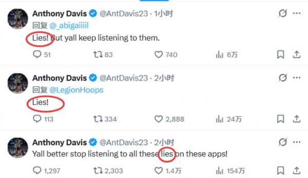 戴维斯对Shams的报道予以否认,并通过社交媒体进行反驳。"大家最好别再相信这些平台上的谎言了。"戴维斯在社媒上写道,随后又在多条援引这一突发新闻的帖子下回复"谎言"二字。
