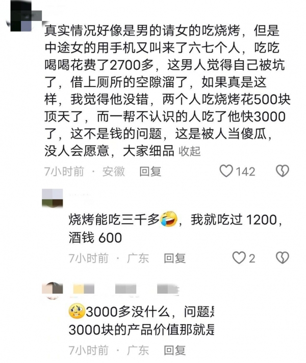 在这些朋友的"热情"邀请下,男子也没有拒绝,他们一起开心地烧烤、喝酒,当他们结束用餐准备结账的时候,才发现原本以为只花了几百元的消费,竟然飙升到了2700元,而且这个庞大的账单并不是男子和女子两个人的消费。