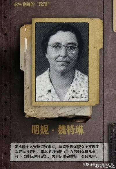 明妮·魏特琳(1886-1941):美国传教士,致力于推动中国女子教育。1919年来到金陵女子大学任学教,大学因战乱搬迁,魏特琳成为留守学校的负责人。从南京大屠杀开始到国际安全区关闭,她一共保护了一万三千多名妇女儿童。