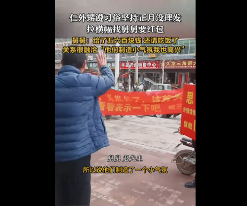 用老民俗玩出新花样,拉横幅的形式很有仪式感,搞笑又接地气,舅舅大方掏钱、外甥调皮要红包,展现了轻松融洽的舅甥关系,戳中很多人的家庭日常。近年来很多网友纷纷模仿,衍生出各种 "正月不剪头要红包" 的段子和视频。