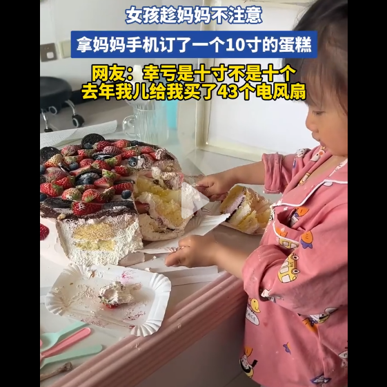 视频中,一小女孩正在分蛋糕,原来是女孩趁妈妈不注意,拿妈妈的手机订了一个10寸的蛋糕。