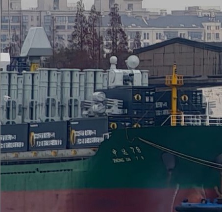 接下来则是这艘船最主要的部分,装满集装箱的舯部甲板,这些集装中疑似的导弹发射架呈起竖状态,每个集装箱里的"发射架"上都有4具筒装物。这些带有疑似导弹垂直发射架的集装箱从左到右舷共有5列,前后共有3排,总计下来就是60单元的大型垂直发射装置,这已经相当于"阿利·伯克"级导弹驱逐舰FlightⅠ或者FlightⅡ批次Mk41垂发单元数量的三分之二。