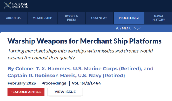 美国海军学会(USNI)网站上刊登的关于探讨使用集装箱武器改装商船的文章