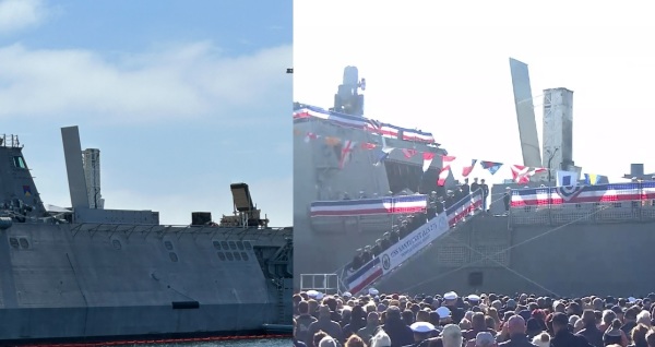 "独立"级LCS-28"萨凡纳"号(左)与"自由"级LCS-27"南塔基特"号(右)濒海战斗舰,分别在舰艉直升机甲板上搭载了Mk70集装箱发射装置进行测试