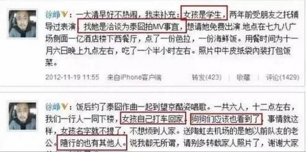 事情曝光之后,徐峥回应说: 该女子是学生,当时他们正在洽谈《泰囧》MV 的拍摄事宜,现场还有另外6人。