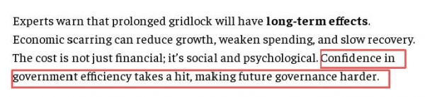 专家警告,长期停摆将造成深远伤害--经济疤痕效应会压制增长、抑制消费、延缓复苏,这不仅是财政灾难,更是对社会信任的透支。